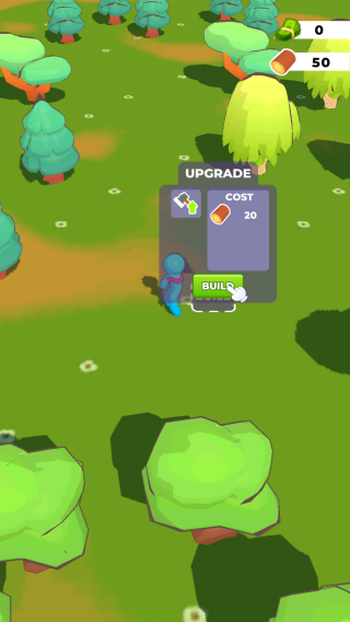 3、显示升级消耗20单位资源(道具样式对应)、BUILD(建造)按钮,以及场景中的树木,玩法围绕角色在场景进行建造、升级操作,消耗资源推进发展。