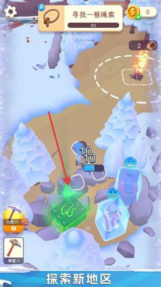 3、开展【探索新地区】行动,依据任务指引(如寻找绳索),前往标记地点挖掘绿色宝箱,获取道具推进探索。