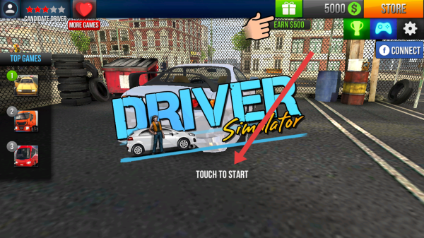 1、进入游戏主界面,点击【TOUCHTOSTART】,即可开启驾驶模拟之旅,正式进入游戏流程。