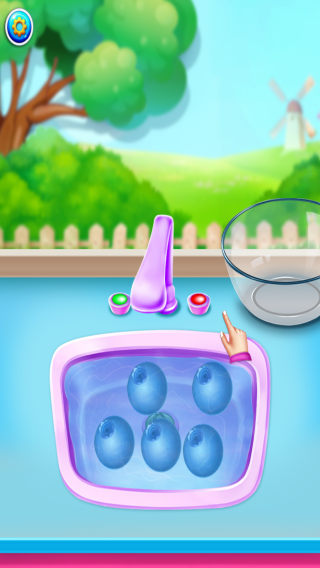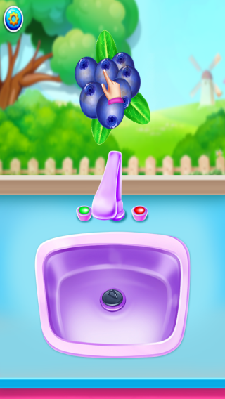 3、实体信息有蓝莓、水龙头、水槽、透明玻璃碗,背景是田园风光,呈现的是水果清洗流程环节,玩家需进行清洗蓝莓等果蔬操作,推进美食制作进程。