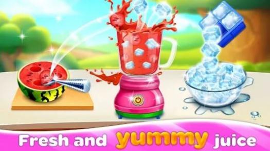 1、画面呈现开场界面,有厨师角色、制作果汁相关食材(水果、冰块等)和操作按钮,玩家可开展果汁制作经营等玩法,体验从选食材到制作出成品果汁的过程。