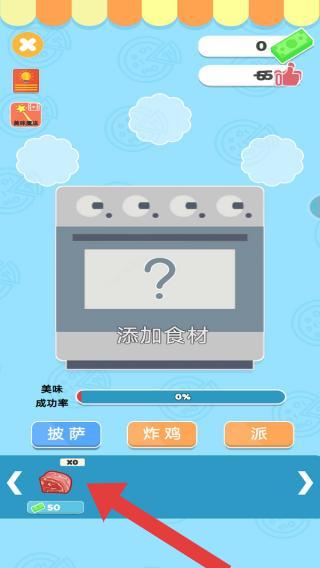 1、界面呈现烹饪操作场景,有添加食材的炉灶,可制作披萨、炸鸡、派,还有美味、成功率、进度条,以及货币(绿色钞票、金币),玩法围绕选择食材、制作菜品展开。