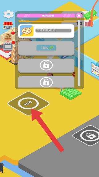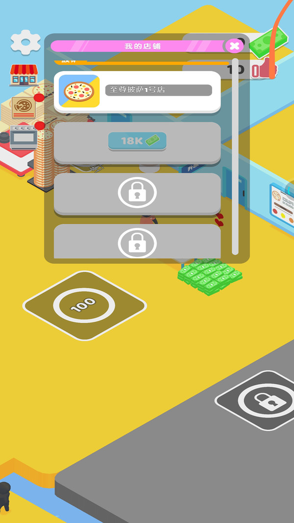 2、显示可解锁的至尊披萨15元摊位,有已解锁(18K金币)、待解锁(带锁图标)的摊位,还有数字100的可操作区域,玩法围绕解锁、经营店铺摊位展开。