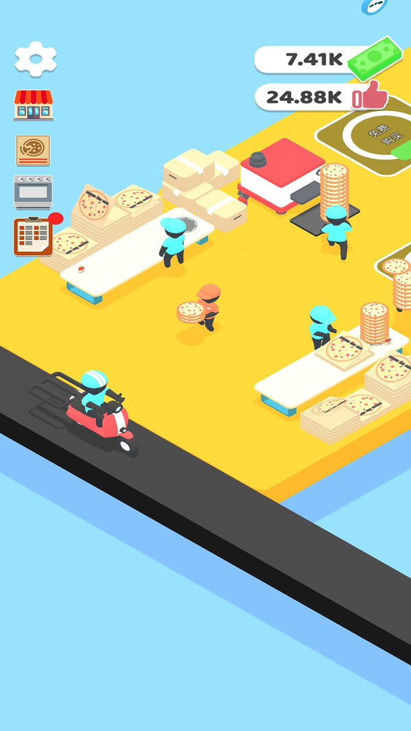 3、呈现披萨店经营场景,有制作、配送等角色,玩法围绕披萨制作、配送及店铺运营展开,属于休闲模拟经营类,可体验从制作到配送披萨的完整流程。