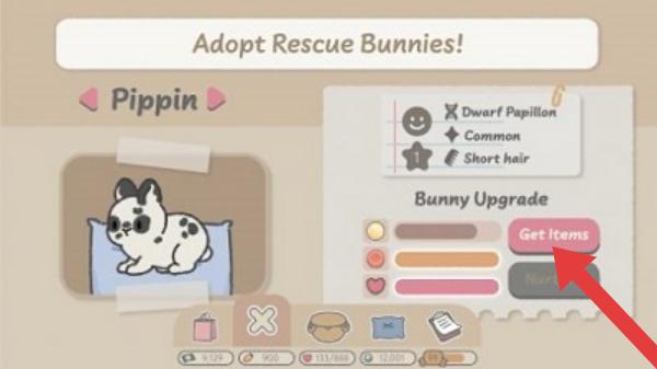 1、兔子名字Pippin,有BunnyUpgrade(兔子升级)及GetItems(获取物品)按钮,用于提升兔子属性。