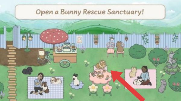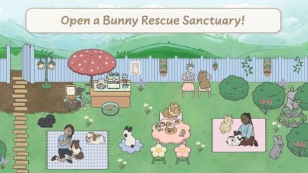 3、画面呈现庇护所场景,有人物、兔子、休闲设施(餐车、桌椅、野餐垫等),玩法围绕经营兔子救援庇护所,照顾、互动兔子等。