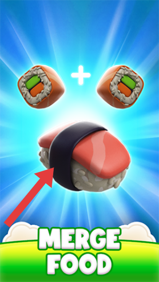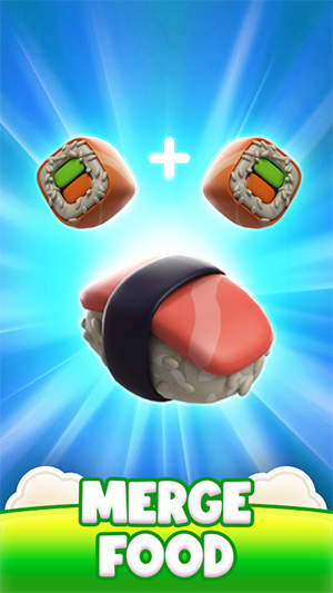 2、画面展示寿司合成玩法,两个相同寿司通过+号合并成另一种寿司,体现合并食物的核心玩法。