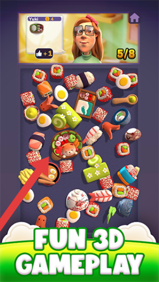 3、角色Yuki、进度5/8、“FUN3DGAMEPLAY”(趣味3D玩法),画面是寿司等美食的消除布局,属于消消乐类型解压。