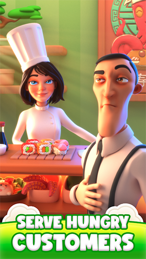 1、画面呈现餐厅场景,有厨师(女性,戴厨师帽)、顾客(男性,着正装),桌上有寿司等料理,体现游戏核心玩法——为顾客提供餐饮服务。