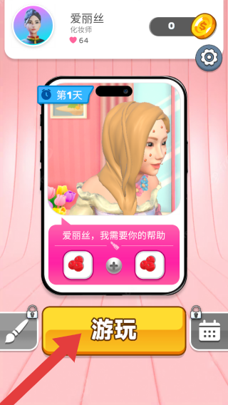 1、左侧画笔(是化妆工具)、右侧日历(是日程或关卡列表),还有金币显示、设置齿轮图标,体现玩家要帮爱丽丝给顾客化妆,开启【游玩】进入美妆关卡流程。