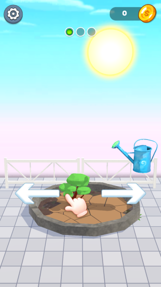 2、画面呈现种植场景,有植物、浇水壶,界面有设置齿轮图标,还有手势指引操作,让玩家进行植物培育相关互动,比如按照手势提示照料植物生长。