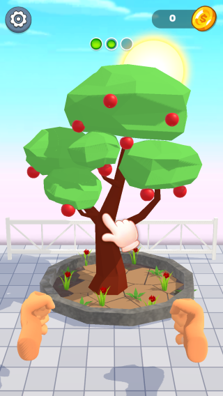 3、画面中是一棵结果的树木,手势指引操作,下方还有类似fists(拳头)的元素,推让玩家进行树木相关互动,比如采摘果实、照料树木生长。