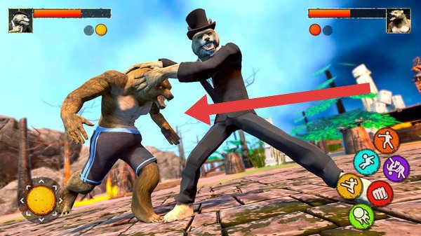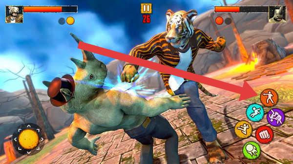 3、操控不同动物角色(犀牛、人形动物),针对敌方弱点(如箭头指向的攻击判定),组合技能,击败对手。