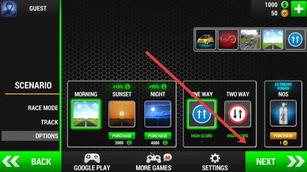 1、车库界面,点击【NEXT】,进入场景设置,选择驾驶环境(如时间、道路模式),准备开启驾驶体验。