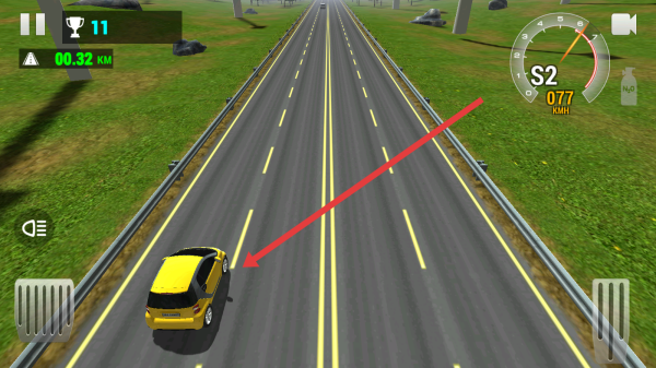 3、驾驶时,操控黄色车辆,沿箭头指引的公路行驶,注意速度表(S2)、距离提示(00.32KM),完成驾驶任务。