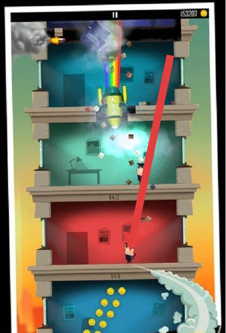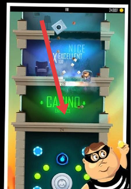 3、下落过程中遭遇火箭等特殊元素,观察其运动规律,调整小偷位置躲避,同时收集楼层金币,保持持续下落推进关卡。