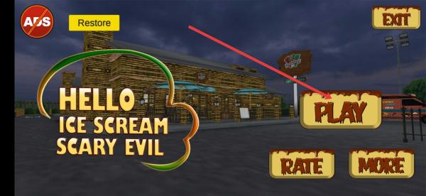 2、在标题界面点击【PLAY】,正式开启《Hello Ice Scream:Scary Evil》冒险,若需退出点【EXIT】,按指引体验恐怖剧情。
