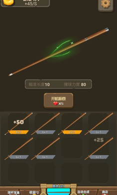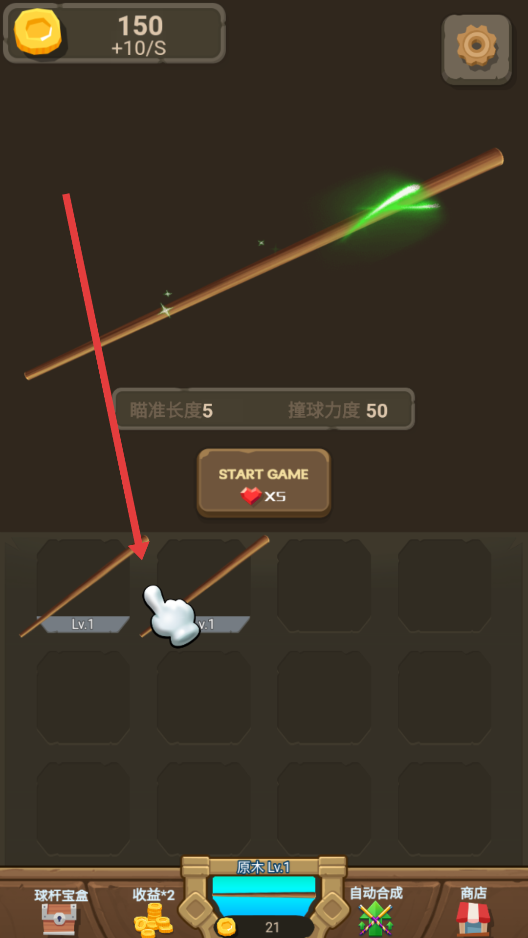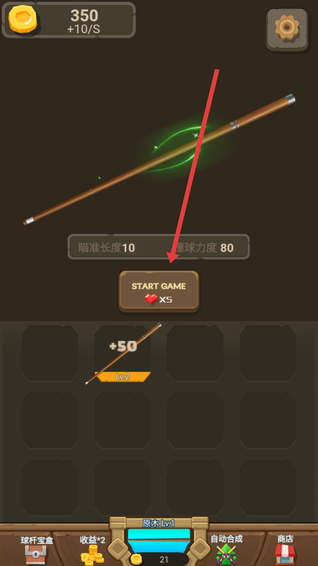 1、开局合成球杆,解锁二级装备,点击中间的START GAME开始。