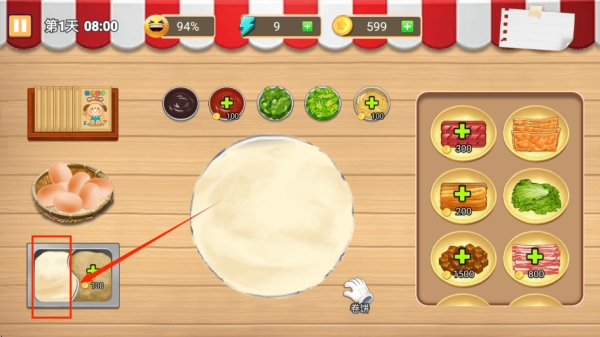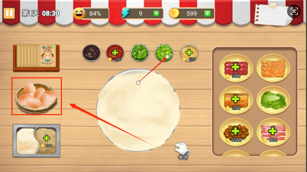 1、订单制作玩法:根据顾客订单滑动屏幕操控竹蜻蜓摊面糊,点击添加鸡蛋火腿等配料,卷制完成后点击装盘交付,注意订单超时会影响口碑。