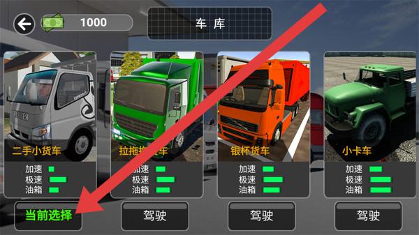 1、在游戏的车库界面,点击【二手小货车】下方的【当前选择】,确定驾驶车辆,为送货任务做准备。