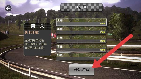 2、进入3D卡车司机驾驶的地图界面,选定关卡后,点击【开始游戏】按钮,正式开启送货挑战。