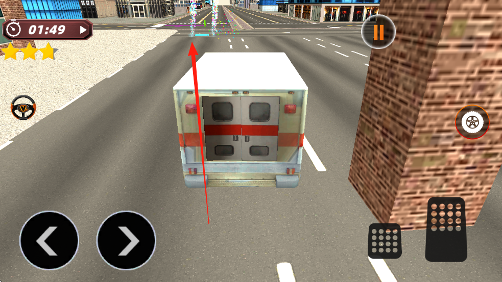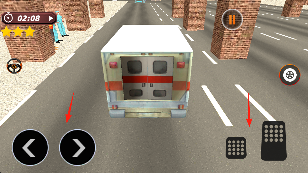 2、驾驶时,用左侧方向键控制救护车转向,右侧按键控制加速,刹车,灵活避让障碍。