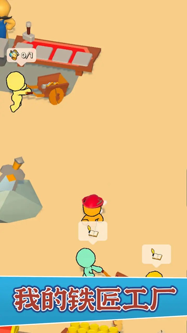 1、呈现的是工坊类经营场景,有角色、工具及任务提示(如0/1这类进度显示),在引导玩家操作角色完成特定生产或搬运等任务。