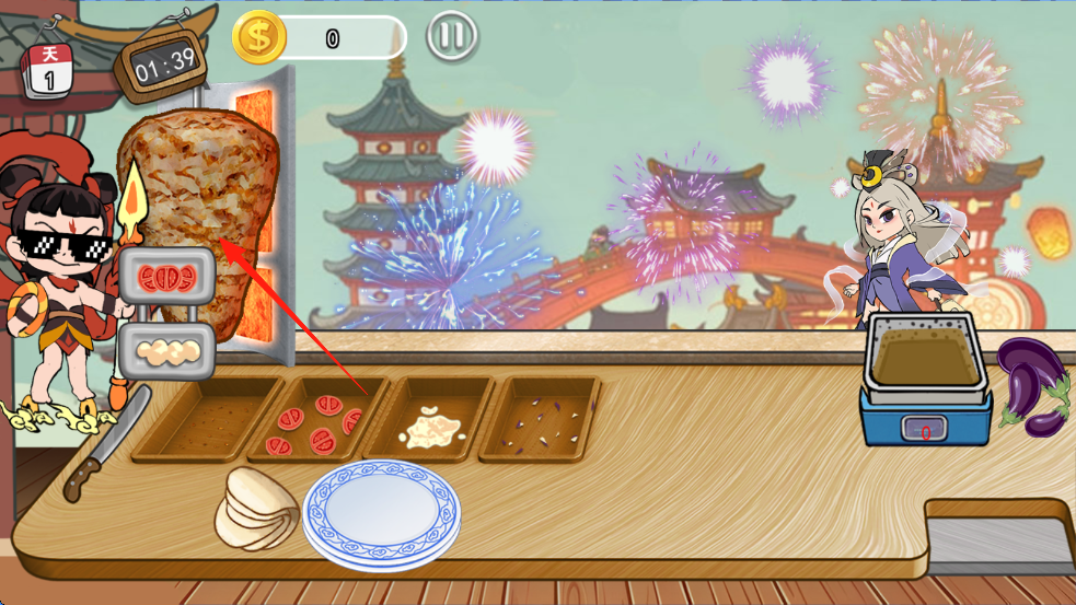 1、制作美食时,先点击箭头指向的烤肉区,获取基础食材,为后续烹饪做准备。