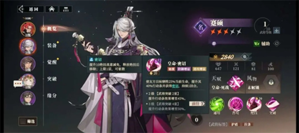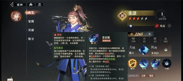 2、养成维度拆解:1级属性为养成基底(张郃2265/贾诩2840),突破系统解锁天赋分支(风物增伤、咒术共鸣),天赋强化技能倍率。