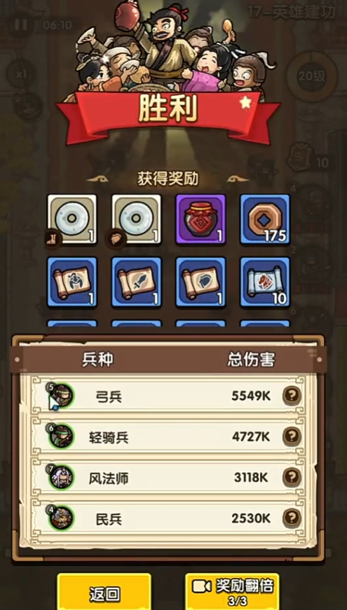 1、奖励差异:对比失败,铜钱提升至175,兵种卷轴品质更优,且开放“奖励翻倍”功能(3次机会),胜利收益显著高于失败。
