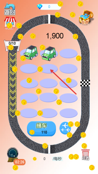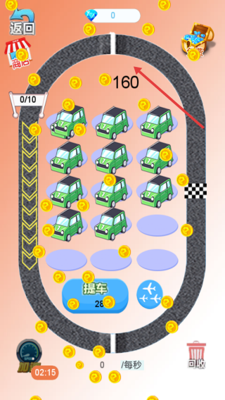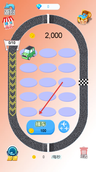 1、点击【提车】花费100金币,在赛道产出车辆与金币。