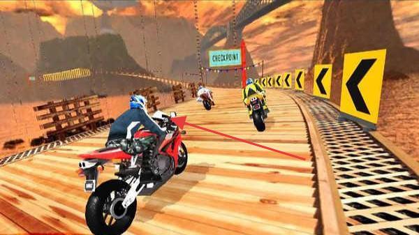 1、在沙漠木桥赛道,驾驶红色摩托,沿路线行驶,留意【CHECKPOINT】标识,超越前方黄、白色摩托。