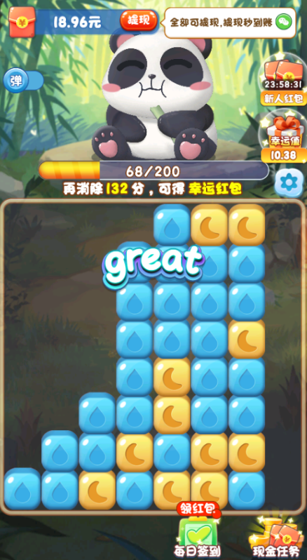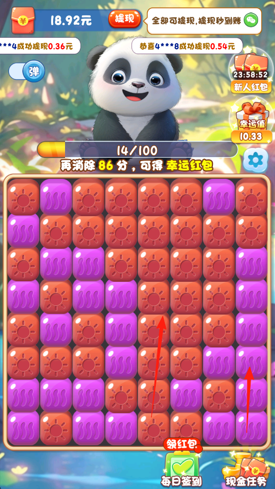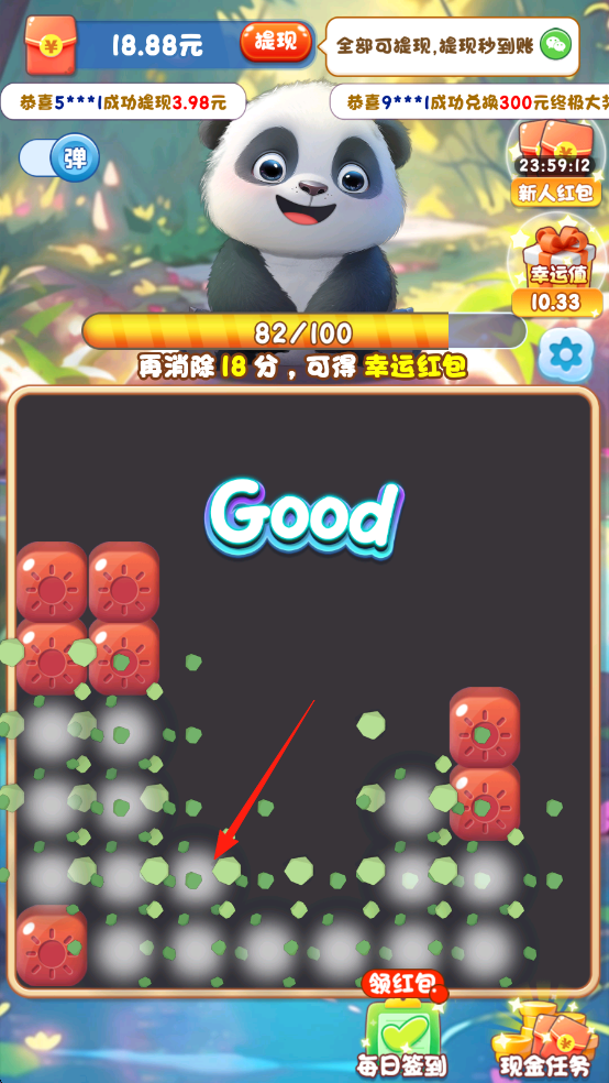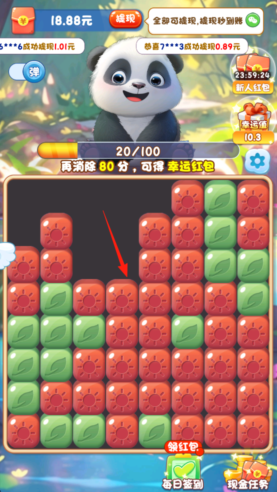 2、消除后产生绿色碎片,点击收集,助力进度条增长,达到100分解锁幸运红包。
