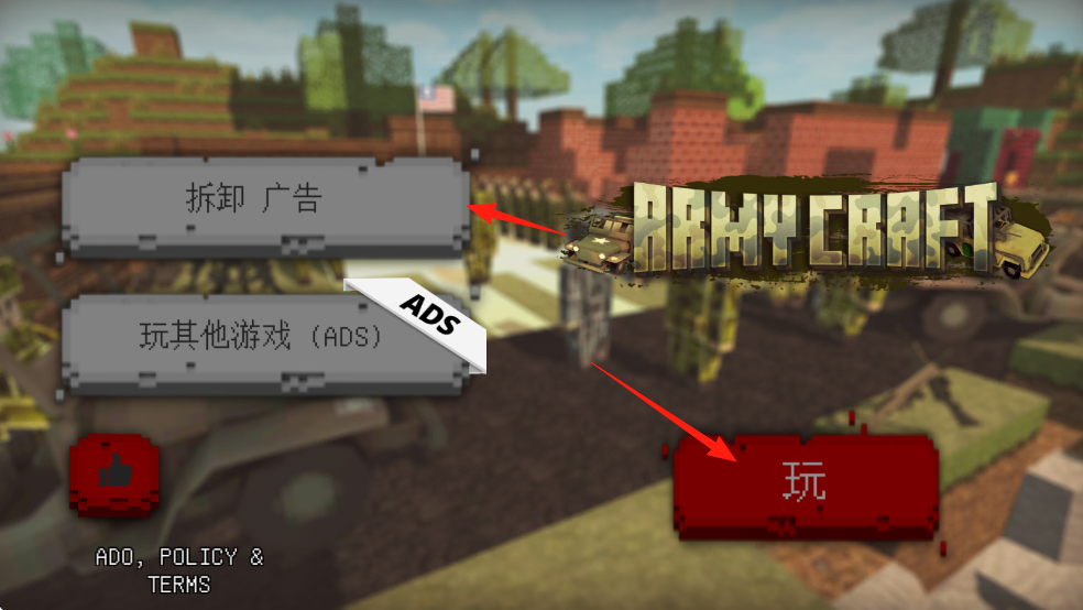 1、主界面点击【玩】,进入游戏战斗模式,可选择观看广告解锁【拆卸,广告】等功能。