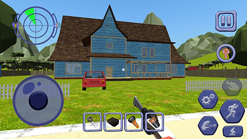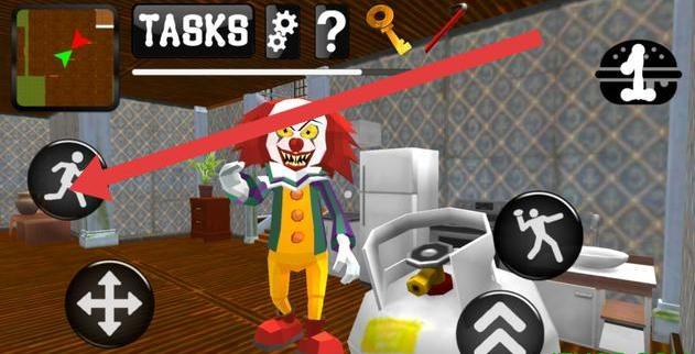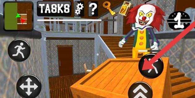 2、在游戏场景,关注【TASKS】接任务,用移动按钮操控角色,遇小丑邻居灵活走位,探索房间找线索。