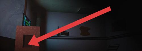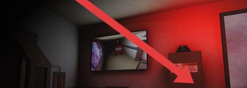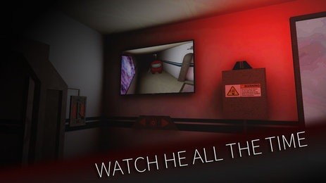 1、进入红色灯光房间,观察电视画面获取线索,留意【WARNING】标识区域,小心潜在危险,收集场景内可用信息。