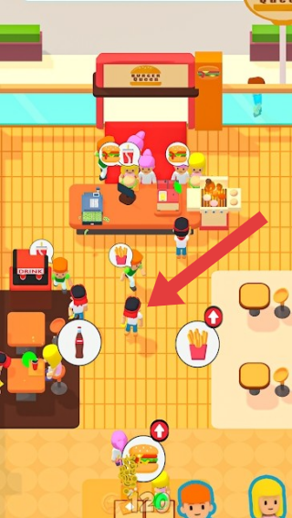 3、呈现快餐店经营场景,有顾客、员工及点餐收银区,玩家需管理服务流程满足顾客需求,围绕店铺运营、资源调配与顾客服务展开,体现模拟经营的核心逻辑。