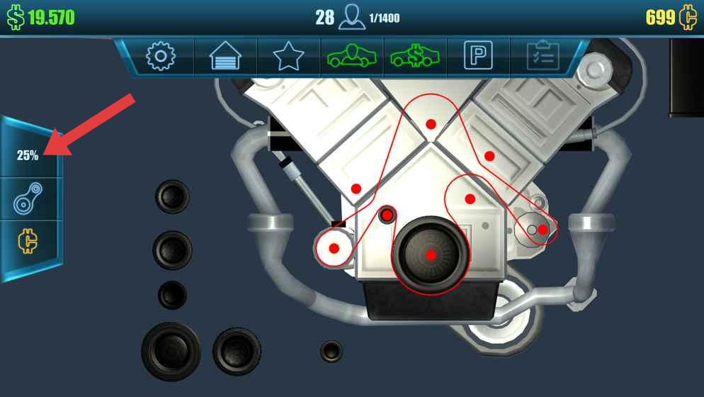 1、关注左侧【25%】进度提示,针对发动机红色标记部件,合理分配资源进行改装,提升引擎性能。