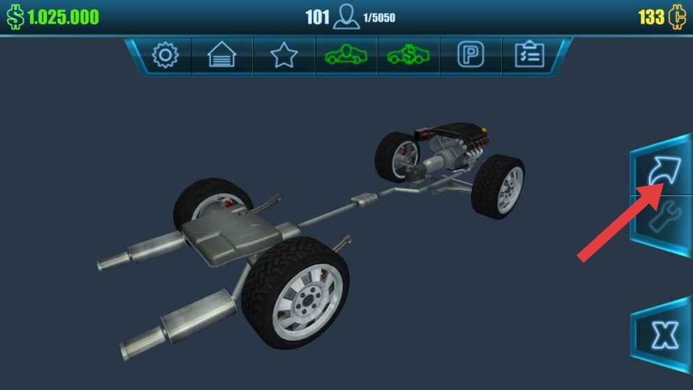 3、需要点击右侧箭头图标,可以切换视角查看车辆底盘结构,便于对底盘部件开展改装操作。