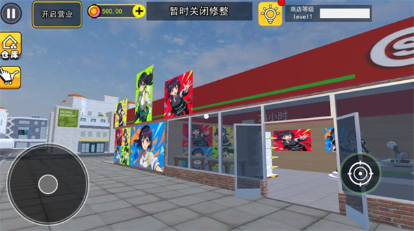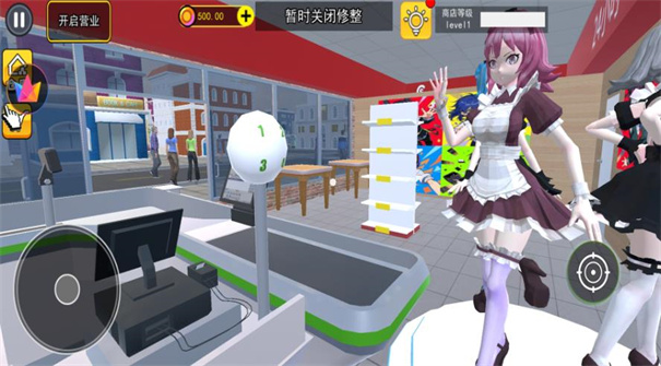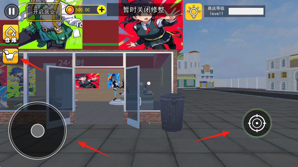 3、经营时,用左侧摇杆移动,点击购物车图标采购商品,通过右侧按钮互动,吸引顾客,提升等级。