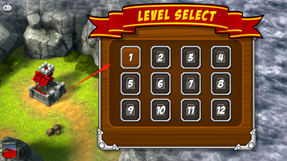 1、关卡选择页,点击【1】进入第一关,开启塔防战斗,抵御敌人进攻。