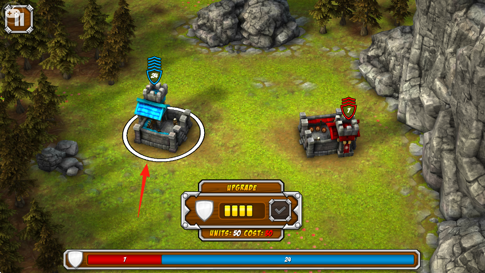2、战斗中,点击蓝色城堡,花费30金币升级建筑,提升防御能力和出兵数量。