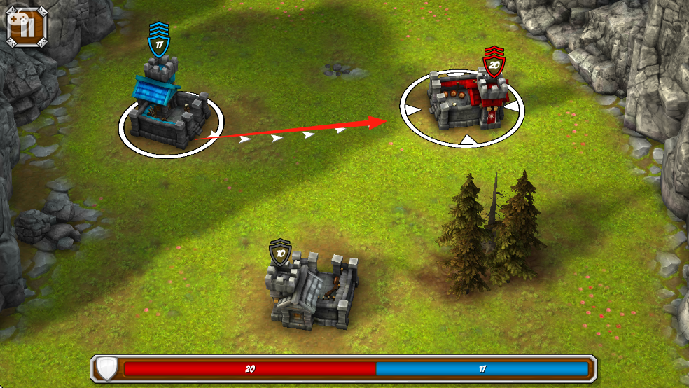 3、操控蓝色城堡出兵路径,指向红色城堡,派遣士兵占领,扩大防御范围,推进关卡。