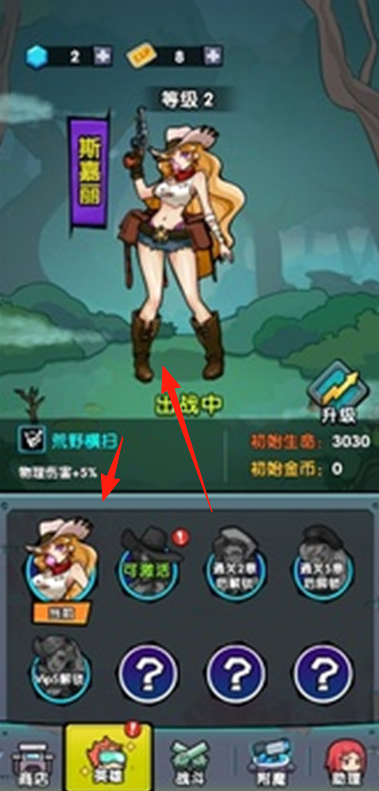 2、在英雄界面,选择“斯嘉丽”等出战角色,查看技能(如荒野横扫),确认阵容。