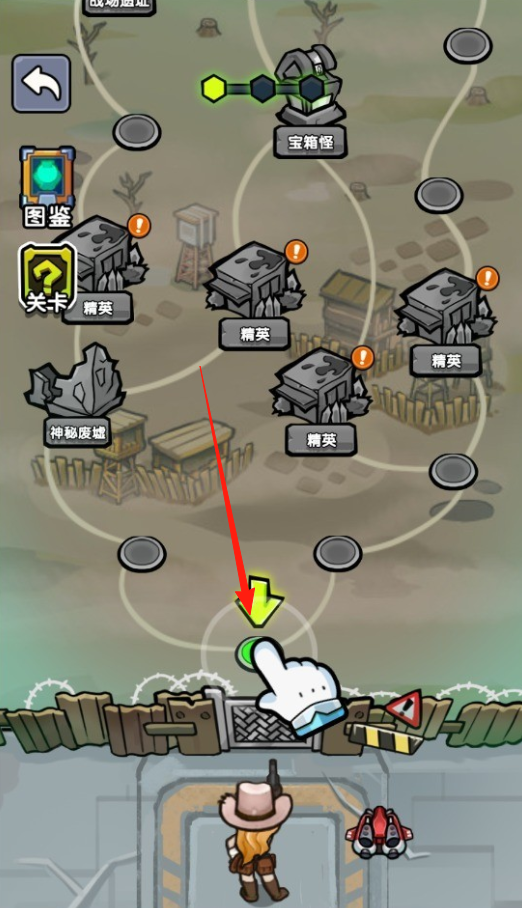 3、地图界面点击绿色箭头指引关卡,进入战斗,布置防御操控英雄,抵御僵尸进攻。