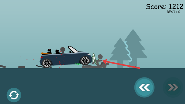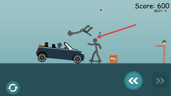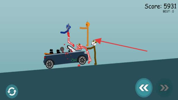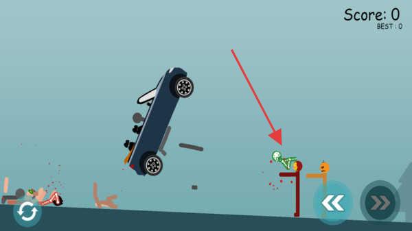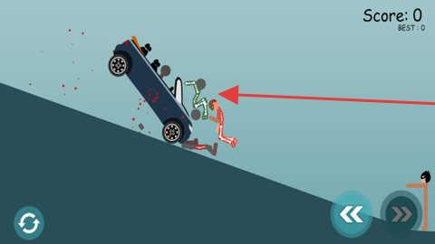 2、让汽车保持倾斜、翻转状态,借助失重惯性,扩大撞击范围,击飞沿途火柴人,刷新得分。