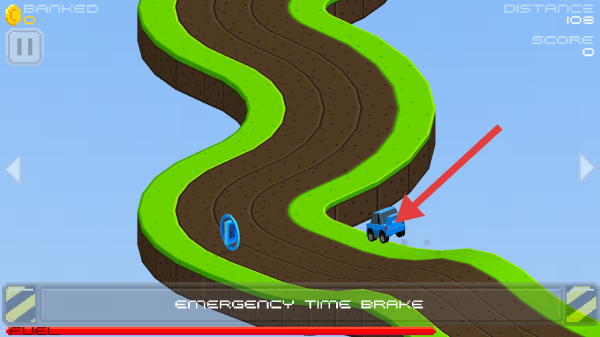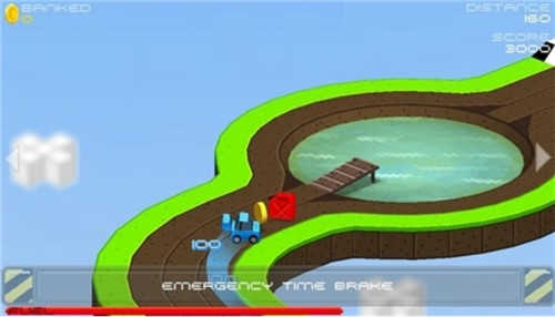 3、驾驶蓝色赛车,在S型弯道赛道,用方向键控制转向,避开掉落,关注【emergency time brake】。