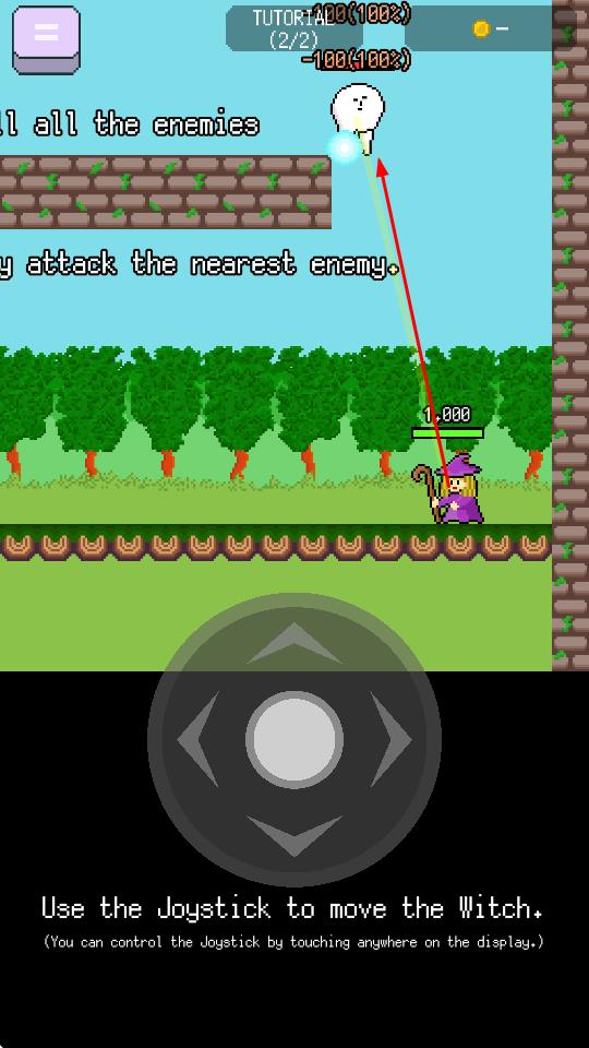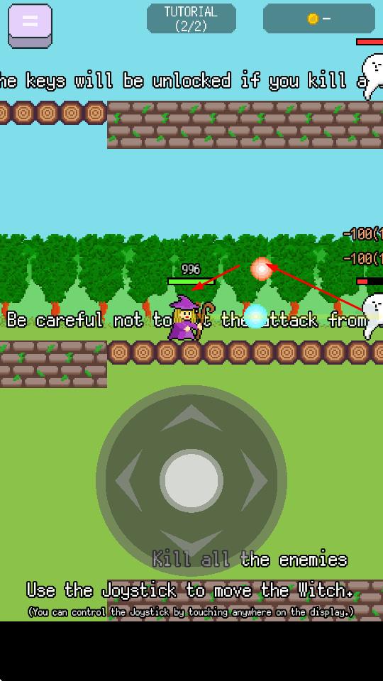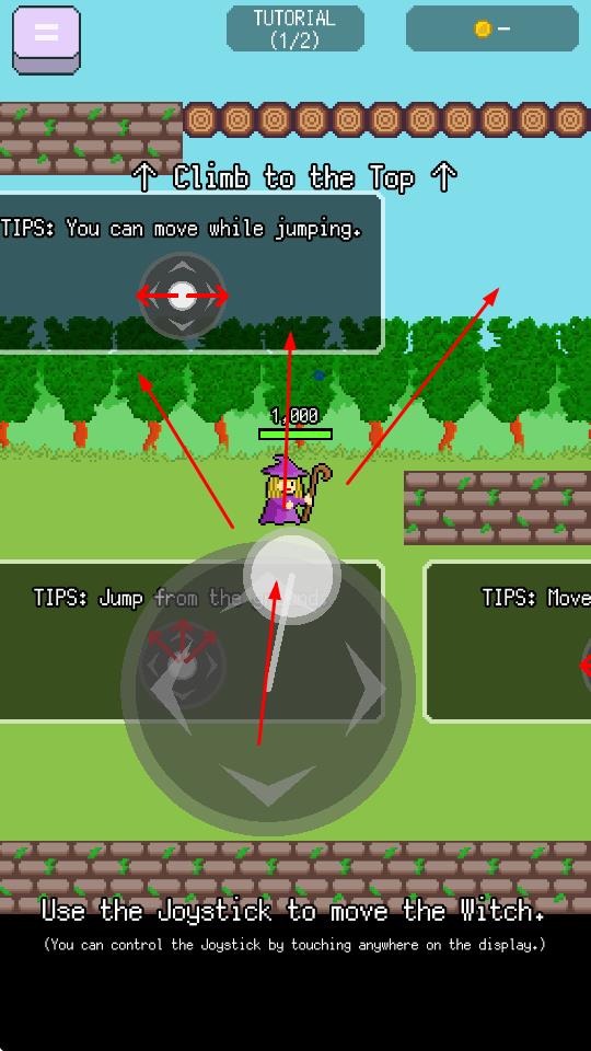 1、用虚拟摇杆控制女巫角色,在关卡场景自由移动,攀爬、跨越障碍,按指引完成目标。