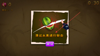 2、依照提示滑过水果进行斩击,熟练掌握基本操作,精准切割水果以得分。