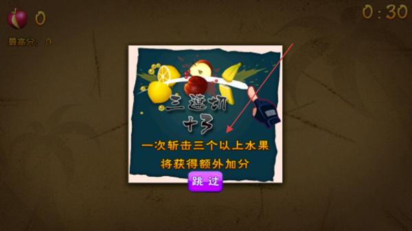3、关注“一次斩击三个以上水果将获得额外加分”提示,尽可能多斩水果,获取更高分数,提升游戏表现。